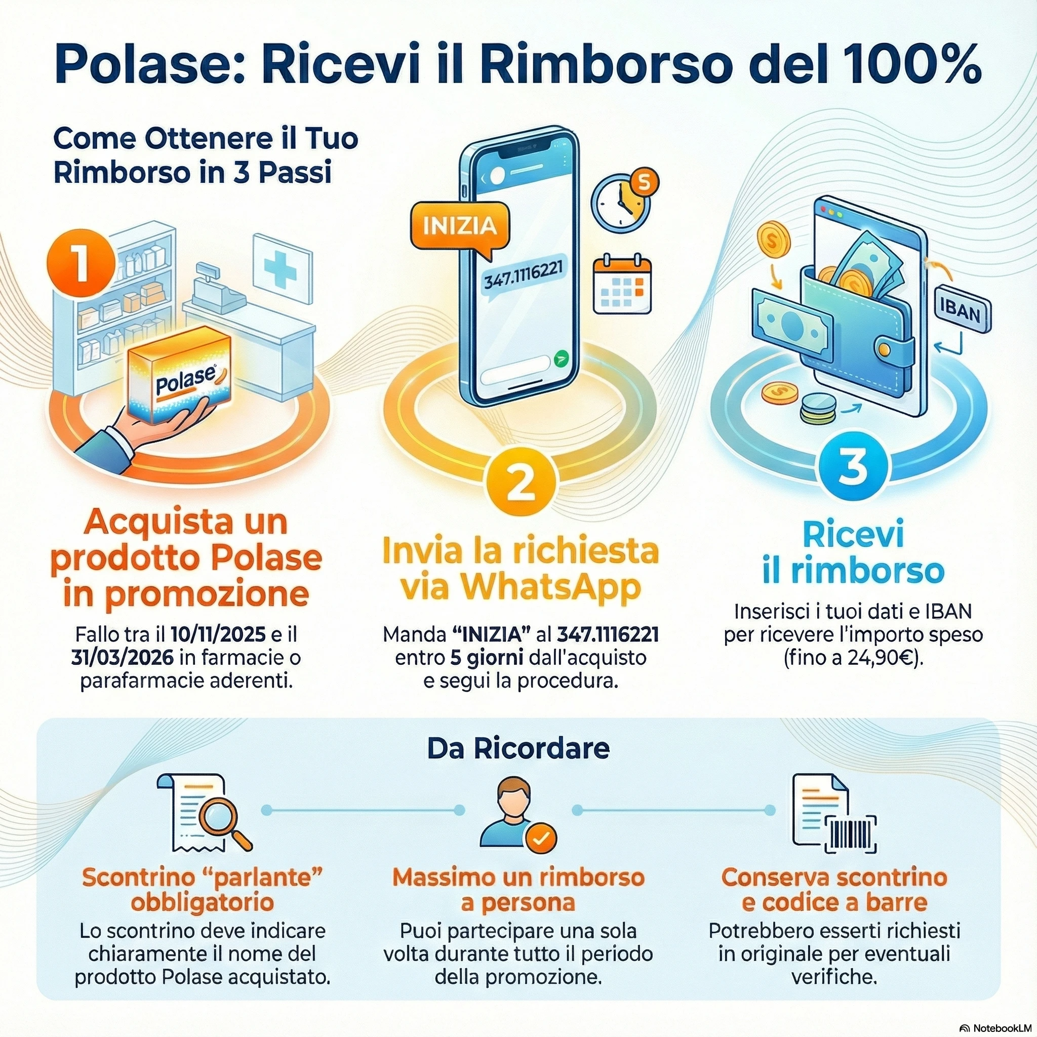 Dal 10 Novembre 2025 al 31 Marzo 2026, acquista 1 prodotto Polase a scelta tra quelli in promozione in farmacie, parafarmacie e corner GDO aderenti. ESCLUSIONI: Acquisti online, Polase Magnesio e Polase Extra Energia.