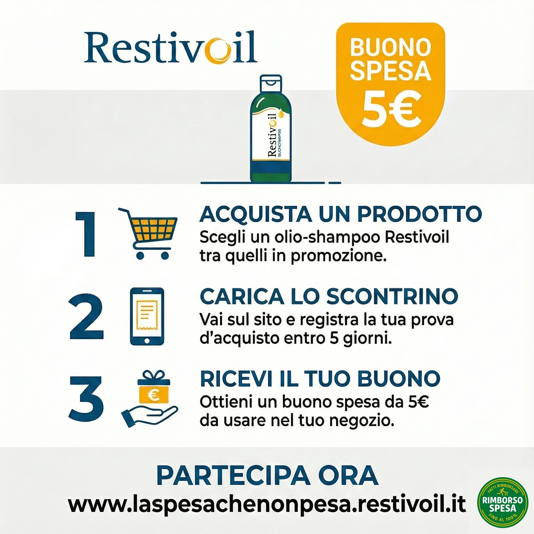 Compra almeno 1 prodotto Restivoil (olio-shampoo 150ml) presso Acqua&Sapone, TigotΓ , Coop, Conad, Carrefour, Bennet e altri supermercati aderenti. Solo punti vendita fisici, esclusi acquisti online.